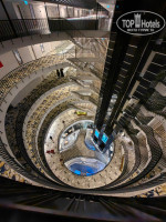 Здание отеля. Так же всё опрятно и чисто. 3 стеклянных лифта. Порой приходилось их довольно долго ждать. Ещё и ломались два из них. Один бар с выпивкой. Ещё один бар в выпивкой и десертами (в дневное время). И один бар ночной - вроде как должен до утра работать, по факту - примерно до часу ночи работает. На нижнем этаже (под землёй) спа (сауны, хамам, подогреваемый бассейн и пр), дискотека с ночным баром (3 раза в неделю), тренажёрный зал, игровые автоматы (платно) и 2 актовых зала (пока на улице холодно, все шоу проходят здесь). Два А-ля карт ресторана. В апреле работал только один - итальянский (не впечатлил). Мексиканский обещали открыть ближе к концу апреля. Большой балкон для посиделок с видом на территорию (см фото).