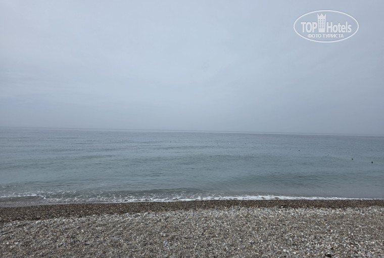 На пляж можно попасть через наземный переход (туда через бассейн надо выходить) или через подземный (туда можно попасть выйдя из центрального выхода и повернуть налево). Затем пройти по территории частных владений и уже тогда вы попадете на пляж, принадлежащий отелю. Конечно, это не соответствует заявленным 200 метрам до пляжа, как указано в карточке отеля. Это как минимум метров 500. Но хотя бы не трудно идти. И не жарко. Хотя на пляже народу не очень много, так как вода всего +20 градусов. Но туристы все равно купаются. Да. и в бассейне вода может только чуть чуть теплее. Но это никому не мешало загорать и купаться. Кстати, вход в море галька. Так, что тапочки специальные нужны. На море и в бассейне анимация проводится. Аниматоры молодцы, стараются.