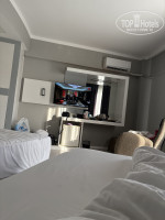 Номер достался в корпусе у бассейна 2 этаж прямо над техблоком ресторана а ля карт, возможно это был самый плохой номер, но решили уже ничего не менять. Достаточно просторный, есть холодильник( вода, газвода при заселении), телевизор, кресло, кондиционер, чайник( чай, кофе в пакетах каждый день) , тапочки. В ванной шампунь, гель для душа, жидкое мыло, крем.