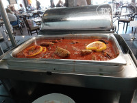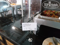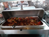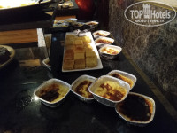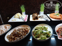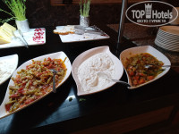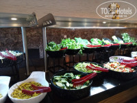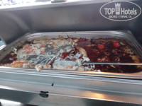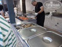 В отеле достаточно много турецких постояльцев, поэтому в питании есть уклон в турецкую кухню. Как любителя турецких мезе меня порадовала стойка с ними. Но не все могут их есть, они достаточно острые по большей части. Большая стойка с "ботвой" - различной салатной зеленью и овощами. С горячим вот сложно. В мармитах обычно нечто в соусах, не всегда разберешь что (таблички не всегда стоят). Кусками видела только жаренную курицу. Еще насторожили маленькие котлетки, которые жарили на гриле не один раз. По вкусу чувствуется, что там преобладают субпродукты, а не мясо.