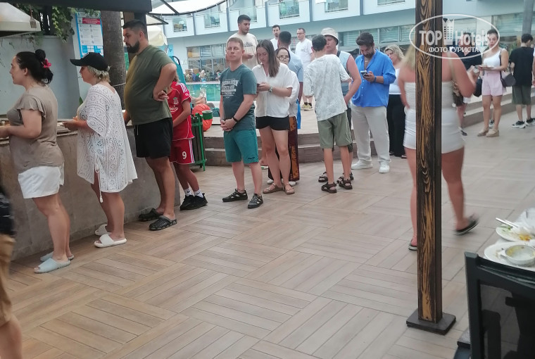 Отель совершенно не соответствует 5 звездам. Это 3 звёзды, но по цене 5. В первый раз я так попала из-за положительных отзывов. Пусть вечно икается тем, кто пишет отзывы за деньги! Еды не хватает, качество отвратительное. С алко тоже беда - на пляже только пиво и местное вино. Отель маленький и неуютный. Не знаю как отель может иметь рейтинг 5 звёзд, это точно не про него. Категорически разочарована. До моря идти по оживленной улице, перейти дорогу - проблема. На территории отеля горки, но, бассейн в горках 50см. Никакого удовольствия ни детям ни взрослым. Спасатель на месте отсутствует, дело спасения в ваших руках. Территория маленькая, неудобная. Не знаю какая была реновация, но и номера грязные неухоженные, как будто им лет 20. Добавила фото очередей за едой. Так и утром и днём и вечером. Ну честно, стоять 15-20 за яичницей, картошкой фри или блинчиками - это вызывает злость. Уважаемые менеджеры отеля, примите меры. Люди к вам не вернутся и другим рекомендовать не будут. Добавлю, что на рецепшн и в барах сотрудники стараются, но тоже зашиваются и поэтому не справляются с потоком. Либо надо уменьшать количество отдыхающих либо увеличивать штат персонала. Ещё из рекомендаций: хотя бы на ужине стелите скатерти. Есть на бумажке неприятно, мы же не в парке на лавке кушаем, а в ресторане. И в ресторане нужна приятная музыка, там всегда тишина и только стук тарелок и чавканье. Ну вы сами то там едите? Неужели приятно? За 20 лет, что посещаю Турцию впервые пишу такой негативный отзыв, но что есть. Ещё раз перечитала восторженные отзывы, в них многое неправда. Вот только не могу понять сделано ли это намеренно или люди писали отзыв про другой отель и не там разместили. Заметьте: как только начался сезон пошли негативные отзывы, т.к. люди реально поехали в отель и все испытали на себе.