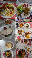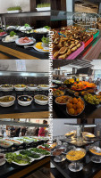 На обед лучше приходить к самому началу. Выбор горячего всегда был из 8 мармитов: 1-2 гарнира, 1-2 тушеные/на пару овощи, овощи с мясом, рыба с овощами, курица/индейка, картофель. Меню менялось, но всё однообразное. Очень много овощей во всех видах. Советую брать курицу, её редко готовили плохо. Рыбы вкусной ни разу не давали: вся с костями, сухая и безвкусная – ну очень плохо, хотя рыбу мы любим и едим часто. Говядина и индейка были вкусными через раз. Под конец я брала только курицу и не экспериментировала. Суп всегда один предлагают. Куриный с лапшой советую. Йогуртный с мятой не решились попробовать, ещё были чечевичный, грибной и томатный. Консистенция довольно слизкая у всех них. Десерты были всякие разные, но большинство не понравились – тут я придира, люблю не приторное и не сухое, большинство тортиков мимо. Один раз за 9 дней давали пахлаву (в "Турецкую ночь")