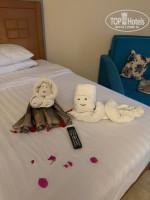 Прилетели мы с Самары с задержкой рейса по вине авиакомпании… на ресепшене нас приветливо встретили, с велком дринк. В номер заселили нас сразу же, при том что был оплачен стандарт, но нам достался хороший номер с видом на море, без каких-либо доплат. Все было чисто, красиво заправленные кровати, забитый лимонадами холодильник. В общем было очень комфортно и уютно.