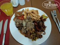 На обед было рис, вермишель, картошка разных видов, супы 2х видов, овощи, мясо нескольких видов (курица, говядина телятина,) рыба, разные закуски ,соленья, сыры, салаты, овощи фрукты. сладости бисквиты пироженое и турецкие сладости (не очень большое разнообразие их) ну и бар в главном ресторане работал уже на обед (пиво, джин раки водка вино и т.д., коктейли в нем не делали)