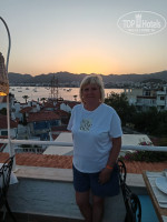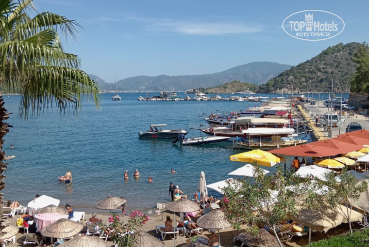 В отель приехали очень поздно, и заезд был достаточно большой — почти весь автобус. Насколько я себе представляю, ужин в первый день у нас был оплачен, но ни о каком ужине речь не шла. В фойе отеля стоял аппарат с горячей водой и пакетики с чаем, мы налили себе чай и доели всё то, что брали из дома, угощая друг друга. Кстати, это помогло нам быстро перезнакомиться. Номер мне достался самый что ни на есть отвратительный в левом крыле, плохо убранный и с убогой мебелью, но я настолько устала, что не стала спорить и легла спать. Тут во многих отзывах пишут про лысого дядю, который вымогает деньги — всё правда. На следующее утро я пошла обозревать отель. Ресторан находится на... как бы объяснить, терраса, балкон, в общем, можно занять столик ближе к краю террасы, есть и любоваться бухтой — очень приятно. Отель — реально первая линия, и это большой плюс. Пляж грязный был. Печально, что теперь и в Турции есть такие вот пляжи с грязным песком и бычками (не рыба — окурки). С лежаками было всё неоднозначно, их вроде бы много, но в определенное время начинает падать тень от ближайшей горы, и нужно искать какое-то другое место для загара. Место на пляже занимала перед завтраком, это легко сделать, так как всё рядом. Местоположение отеля — отдельная история, как по мне — отличное. Первая линия, рядом очень красивая гора, если пойти в правую сторону от отеля, с дороги открывается прекрасный вид на открытое море, яхты и катера — можно пофотографироваться. Мимо отеля проходит прекрасный променад. Можно вечером погулять и по нему выйти в Ичмилер, в самую оживленную его часть. Поднимаешься наверх — автобусная остановка. Несколько минут, и ты в Мармарисе. Можно посетить старый город. Посидеть в кафе на крыше, попить кофе и полюбоваться закатом. Но отель...