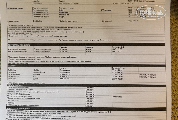 • Особенности: Нужно быть готовым подстраиваться под расписание отеля, чтобы ничего не пропускать и наслаждаться отдыхом (прикладываю фото). Шаттл до пляжа работает с 08:30 до 18:00.