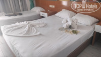 Небольшая комната, квадратов 12, кровать двуспальная и односпальная. Балкон с видом на соседний отель, его территорию и волейбольную площадку. С противоположной стороны расположена кухня и там на балконе можно почувствовать что сегодня готовят на кухне). Балкон небольшой, два стула пластиковых и столик, есть вешалка для небольшого белья. Там сушили купальники, на стульях лежаки. ВАЖНО! Если будете сушить мелкие вещи - закрепляйте их прищепками к ограждению на самом балконе или чем-то еще. Я привязывала свои купальники узлом к перилам, так как временами бывает сильный ветер и может сдуть, что у нас однажды и произошло). Потом ребята, сотрудники отеля, бегали собирали вещи всех постояльцев, которые сдуло с балконов. Урожай был большой))) Персонал понимает по-русски. На ресепшине говорят на русском свободно. Так же в номере есть большой шкаф с ящиком, много полок, вешалки. В номере стоит мини-холодильник в тумбе, ящик, зеркало, у кровати тумбочки. Розетки везде в удобных местах - большой плюс. Кому нужно - есть телевизор и канал ТНТ). Кондиционер, который работает).