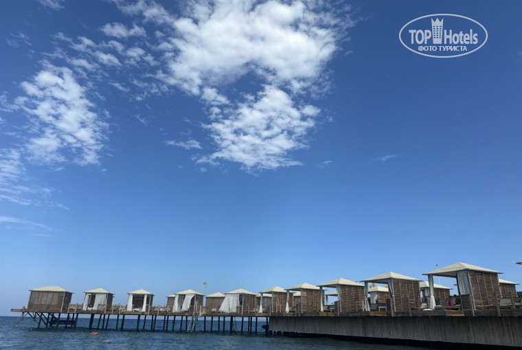 Смешанный пляж — песок с мелкой галькой. Вход — по пирсу или по пологому спуску. Для детей — комфортно. Вода чистейшая, прозрачная, без медуз и водорослей. Пляж убирается ежедневно. Есть возможность взять павильон с индивидуальным обслуживанием (платно), но и в обычной зоне нам было более чем комфортно.