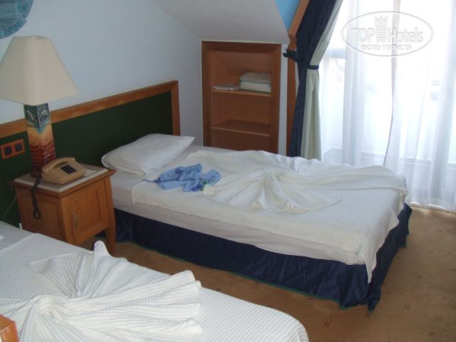 Номера маленькие. В номерах на верхнем этаже скошенный потолок (см.фото), поэтому мы там набили несколько шишек. Кровати нормальные. ТВ с одним невероятно тупым русским каналом (ОРТ для Украины, сплошные Петросяны и шоу "Пусть говорят"). Большие номера - в Forest.