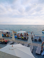 Про пляж. Пляж чистый. Убирают каждое утро. Есть спасатели. Постоянно следят, чтобы не плавали за буйки. Вода очень чистая. Мы попали как-раз в хорошую погоду, на море штиль, дно видно. Просто здорово! С утра вообще-кайф! Вода теплая, мягкая, вылезать не хочется. Берег-мелкая галька вперемежку с крупной. Я по гальке не могу ходить, но на этом берегу около воды спокойно ходила - прекрасный массаж для ног. Днем , конечно, детвора перебултыхает море у берега, что такой чистоты нет. На пляже предлагают разные аттракционы. Предлагают поездку на катамаране на встречу с дельфинами-100%. Этому верить нельзя. Мы вышли в море рано утром и гонялись за двумя дельфинами, которые показали свои спинки пару раз метрах в 500 от нам. Конечно, удовольствие получили просто потому, что проплыли на прогулочном катерке.