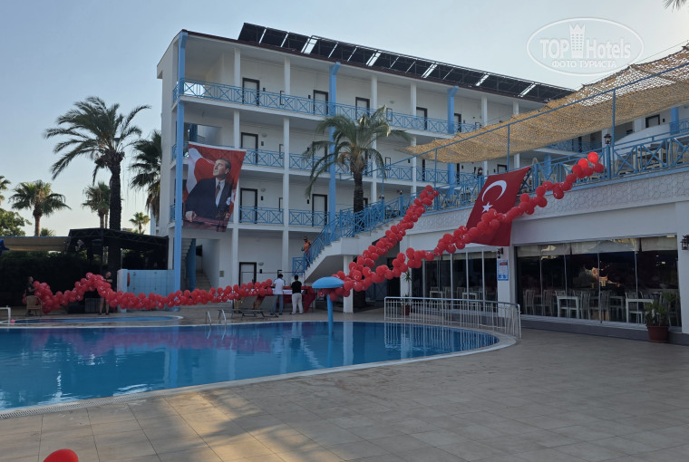 Отдыхала одна,с 4-11 августа.Приятно удивлена была: сразу же,как только приехала,дали браслет и предложили сразу же пройти на обед в ресторан.Про отель: Отель небольшой,компактный,все рядом.бассейн тоже небольшой,с водными горками и бассейном для маленьких деток. рядом с бассейном всегда были свободные шезлонги.Очень порадовало то,что Точно по времени включали водные горки.Бесплатный wi-fi лишь на ресепшене.Желаешь разговаривать из номера-плати 10 долларов за все время пребывания.О номере:Номер был на 1 этаже,с балконом.Каждый номер имеет свое название.Я жила в номере "Balu".В номере было чисто.Была удивлена,когда не увидела отдельных флакончиков с шампунем,гелем для душа...Здесь был в душевой кабине один флакон ....Мусор выносили и протираом пол,Но постельное за неделю ни разу не поменяли.Есть,конечно,минусы: требуется и ремонт номеров,и точно не хватает бара на пляже,и пляж далековат от отеля .Питьевой воды в стаканчиках нет.Но если вы приехали ради моря,то на такие минусы просто не стоит обращать внимание.Плюсы: отличная,разнообразная еда в ресторане.Я была очень удивлена особенно когда на турецкую ночь такого огромного тунца начали готовить! Туристы смотрели с открытыми ртами!Очень понравиося отзывчивый персонал отеля: могли помочь все,к кому обратишься;Кстати очень понравилрсь то,что на ресепшене есть мини- библиотека: выбирай книгу на любом языке.Рядом с отелем торговая улица ,несколько аптек,бутики с разнообразными товарами.Хочется поблагодарить сотрудников с ресепшена и работников ресторана! Спасибо Вам за отдых!