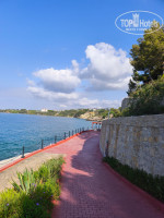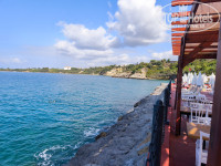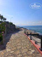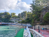 Пляж с пологим входом, песок. До пляжа можно спуститься как по лестнице (довольно крутые ступени, для кого-то может быть проблематично), так и по пологому спуску, мимо бара. Имеются места для отдыха на пирсе. Море шикарное. Теплое, чистое. Пляж в небольшой бухте, так что море спокойное. Лежаков всегда в достатке, песок на пляже каждое утро проходят граблями.
