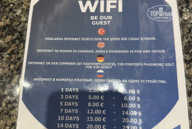 Самый шок - это отсутствие интернета! Ну то есть он есть бесплатный только на территории лобби. Дальше - покупай и пользуйся! 3 дня 3 доллара и тд (фото прилагаю). Чтобы продавали интернет в отделе, да еще и который заявляет себя на 5 звезд - для меня что-то новое! При покупке интернета, он отлично летает и на море и в номере и на бассейне.