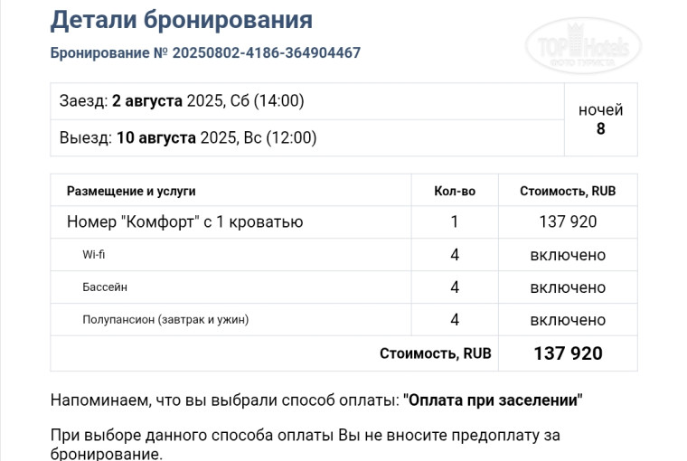 Напишу очень подробный отзыв по существу. Цена абсолютно не соответствует качеству предоставляемых услуг. Забронировали номер на 2 взрослых и 2 ребенка на 8 ночей (за что заплатили 138 000 руб.), но с трудом прожили 4. Ушли со скандалом. С самого начала брони начались неприятности. После того, как внесли предоплату за бронь, бухгалтерия очень долго не могла подтвердить бронь. Затем был вопрос, что если мы приедем раньше 14.00 ч., смогут ли нас заселить. Ответ был, что да смогут, если заплатим половину суточного пребывания (~8700 руб.). Спросили есть ли трансфер с аэропорта, сказали, что он стоит 1000 руб. (доехали на такси за 460 руб.). Комната очень маленькая на 4 человека, мебель сломанная, шторы старые и неглаженные, обои грязные и отошли от стены, нет розеток, вилка от фена ржавая, что даже не лезет в розетку, фен старый, плитка в туалете сломанная, урна в туалете открытая, чтоб все видели, кто чем вытирался, уборки была всего 1 раз, не хватает полотенец, недоложили зубной набор, кровать вся шатается, комод не закрывается и разваливается, питание не разнообразное, полотенца старые, выстиранные и с пятнами, воды в кулере нет несколько дней, чайный набор на две персоны, а не на 4, телевизор не работает, нет балконов, вещи не сохнут совсем, очень сыро везде, сырость и грибки в душе, бассейн маленький, замки на дверях заедают, ужин не греют, если вы уедете на экскурсию на целый день и вернетесь ночью, греть не где, в коридоре пахнет мышами, слабый вай фай. Когда возмутились про все косяки, сказали, что в октябре будет ремонт. Но мы то заплатили в этом году такую цену, на абсолютно все равно, что у них будет в октябре. Что не съедено вечером, согреет на завтрак, фрукты делят в столовой на маленькие кусочки. Даже бедный маленький абрикос поделен на 4 части, что его не хватает на всех. Отель заявлен, как семейный. Подразумевается, что туда приезжают семьи с детьми. Но для детей там нет ничего, а ночью приезжают мужчины с девочками и пакетом алкоголи, снимают номера на 1 ночь. Отдельная история – пляж с лежаками якобы для отдыхающих этого «отеля». Если ты не успел прийти на пляж с утра по раньше, то лежаков для тебя не останется, т.к они туда пускают всех неотелевских за оплату, а ты забронировавший отель с собственными лежаками в пролете и лежишь на пляже на своем покрывале, либо идешь искать платный лежак.