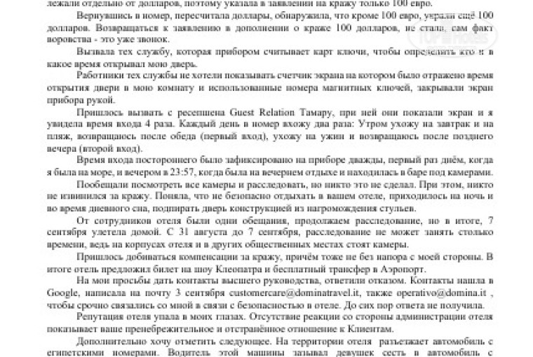 Я не выдвигаю необоснованных обвинений, не требовала компенсации, а лишь просила разобраться в ситуации, провести расследование кражи из сейфа в моём номере, где я жила одна и код знала только я.