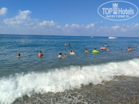 Минусы - отвратительный пляж. Очень плохой заход в море, очень резкий. Понтона нет. И все время были очень сильные волны, как нам объяснили это такое место. Я еще очень удивилась, когда в первый день на пляже увидела, что в море почти никто не купается. Представляете - жара, вода +30, и 10 человек в море. Там очень опасно, из-за того, что дно резко уходит вниз и волн, выйти и зайти очень трудно.