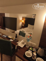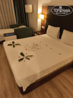 Номер попался небольшой, на втором этаже корпуса «В». Балкончик совсем маленький, только белье посушить, сесть не получится. В других корпусах балконы полноценные, нам и так нормально было. Вид из окна на соседний корпус. На столе обнаружили приветственную бутылку вина, которую сразу же опорожнили, печенье, в холодильнике две бутылочки фанты и две колы, 1.5 литра воды. Холодильник постоянно пополняли. В ванной комнате чистенько, мыло, гель для тела и шампунь из емкости на стене, отдельных флакончиков не было. Полотенца меняли ежедневно. Халатов и одноразовых тапочек не было, но они нам и не нужны были. В прихожей в шкафу есть сейф (не пользовались), несколько вешалок. Вешалок маловато, всю одежду не повесили. В номере имелся телевизор, встроенный в зеркало. Каналов много, но российских нет. Телевизор мы не смотрели.
