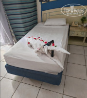 И вот тут первый треш. Номер первый этаж 2511. Да, старая мебель, были готовы и не удивлены, но санузел....такого у нас еще не было...Старая грязно-ржавая ванна с заплесневелой грязной шторкой на 5 крючках. Душ еле течет. Уборка каждый день, весьма посредственная, заправил постель, скрутил из наших мокрых полотенец фигурки, протер пол- все....Сантиметровая пыль на тумбочках и столах....не, не видим. Постельное не меняли, полотенца тоже не особо. Через неделю пребывания, муж подошел на ресепшен без жалоб и претензий поинтересовался, как часто должны меня постельное и полотенца. Вот тут среагировали быстро, приперлись в 10 вечера и все поменяли. Первые два дня был неплохой уборщик, даже букетик притащил, потом был по-моложе....уборка ни о чем, вернее никак),но оставляли всегда 1бакс, а они не отказывались)