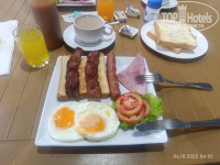 Не помню, то ли с июня, то ли с июля 2025г. завтрак в отеле (с 06 до 10), так называемый "А-ля карт", т.е. без привычного шведского стола. Кофе, вполне нормальный, не гадкий, чай. На отдельном столике вареный яйца, листья салата, помидорки черри, кукуруза, тостовый хлеб, масло, джем, это всё. Когда приходишь, подают стандартную тарелку: 2 глазуньи, тост, 2 ломтика бекона, сосиска, ломтик ветчины, лист салата и 3 кружка помидорки.