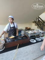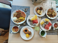 Завтрак - очень достойно. Всегда были горячие блюда из курицы, свинины, из рыбы - иногда. Куриные и свиные сосиски, фасоль, пад таи и разная лапша, картофель и тушеные овощи. Каждый день новый суп-пюре. На террасе жарят яйца с разными наполнителями и с беконом. Тут же вкусный бульон с мясом и зеленью. В тарелках на витрине видно уже готовое наполнение, которое заливают бульоном. Не сразу это увидели. Ветчина, сыр, вареные яйца, салаты, зелень, кимчи и чука. Фрукты - арбуз, ананас, питахайя или дыня. Ежедневно ведётся ротация части блюд. Выпечка одна и та же – 2 вида кексов, 2 слойки, три джема, кленовый сироп и мед. Каждый день был новый тайский десерт, который как-то ни разу не зашёл. Гораздо интереснее были паровые баны в специальной витрине - азиатские пельмени с разнообразной начинкой, в том числе и со сладкой. Также были два холодных напитка, кофе, чай, какао, горячее молоко. Еда постоянно пополняется. При входе в ресторан записывают номер комнаты. Можно поесть на террасе на свежем воздухе или в зале с кондиционером. Убирают быстро.