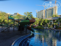 Мы прочитали много отзывов, посмотрели все видео об отеле и на нём остановили свой выбор. Часть отзывов была негативная, но многие уже устарели. В отеле была проведена реновация, установлены везде новые кондиционеры, в основном бассейне установили две хорошие горки и две горки в детский бассейн. Главное, что повлияло на наш выбор – это зеленая территория и большой бассейн. Посреди бассейна – остров с баром с подходом и с суши, и с воды, с деревьями и лежаками под ними. Там же возле бара выдают пляжные полотенца. Да, они меньше обычных, но никто не запрещает вам брать их по два на человека. Полотенца выдают с 8-00 и просят сдавать к 18-00, там даже какой-то штраф прописан за не сдачу, но не все это могут делать, так как с пляжа или с островов могут возвращаться позже. Из персонала кто-то внимательно следил за выдачей полотенец, кто-то не очень. Когда берешь полотенце, то пишешь номер комнаты и фамилию, а при сдаче – расписываешься. Один раз кто-то взял два полотенца на наш номер и фамилию неразборчиво написал. Может даже и не с отеля. В общем, без карточек, как в Египте, порядка не будет. Хорошо, что из-за полотенец не придираются, ничего не сверяют. Большой бассейн работает до 20-00, но вечером никого не выгоняют. Плавают в нем и рано утром. Да, бассейн разделен двумя мостиками к острову и стенкой под ними на две части: северную и южную (там, где горки). Через стенку под мостиком многие спокойно переваливались из одной части бассейна в другую. Южная часть бассейна прикрыта от солнца корпусом здания отеля, и вода в нем чуть прохладнее, чем в северной части бассейна. Лежаков всегда было достаточно. Занимать заранее их не всегда получится. Полотенца часто с утра снимают и уносят к месту выдачи у бара. Однажды мы позавтракали, взяли полотенца в 8-30, заняли лежаки, пошли переодеться, а наши полотенца сняли, как и многие другие, даже личные. Бывает, когда поздно приходишь, то хороших мест под зонтами трудно найти, но там есть много мест с естественной тенью от деревьев и от самого корпуса отеля. Глубина бассейна – 1 м и 160 см. В бассейне отеля Sunshine Garden – 160 см и 3 м.