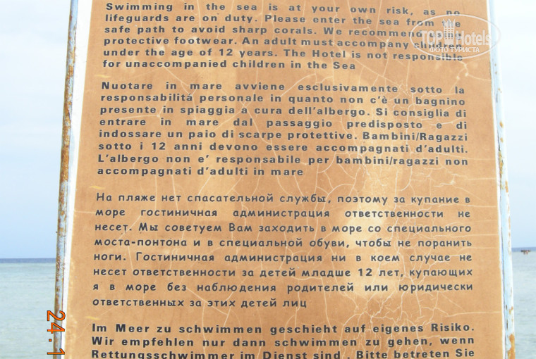 3) На пляже чудо-табличка (см. фото), где прописано, что в море заходить нужно в обуви и с моста-пантона. Где он? Мы и остальные отдыхающие пантон на пляжной линии отеля не нашли. очень много туристов поранились о кораллы, причем одна женщина так разрезала ногу (и тапок, и стелька, и нога), четыре шва наложили. Да, рыбки классные, но и подертых, и в синяках людей было очень много.