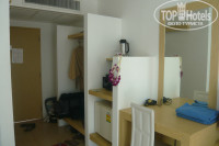 2 кровати достаточно мягкие и удобные, спать на них одно наслаждение))) Двухспальных кроватей здесь нет, все что вам предложат - соединить эти 2 кровати. Также в номере есть тумбочка, шкаф для одежды без дверок, т.е. открытый (на фото видно), тумба, стол со стулом, ТВ с плоским экраном. Кстати, мы частенько смотрели телевизор, очень большой выбор каналов, есть и русские. На балконе есть стеклянный столик и 2 кресла, можно посидеть вечером и поужинать.