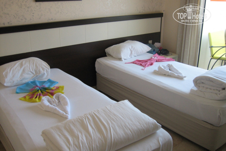 Я жила в двухместном номере на 4ом этаже. Номер маленький, но вполне уютный. Телевизор, кондиционер, фен в рабочем состоянии. Лампы в комнате не очень яркие, читать было невозможно. В ванной комнате под раковиной была вентиляция и из нее был ужасный запах, приходилось затыкать туалетной бумагой. Вид с балкона был на территорию нашего отеля и других отелей, было видно море.