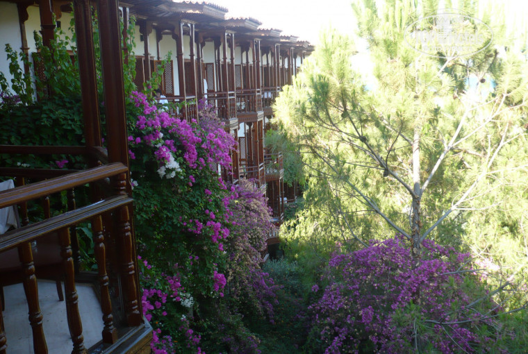 Мы с женой жили в Hotel room (цена значительно выше, чем в бунгало и это, действительно, оправдано - всё рядом, удобно и комфортно), с видом на море и на сад. Наш номер был на 3 этаже. Внизу (на 1 этаже), прямо под нами – кресла в лобби баре, там часто сидели люди, что совсем не мешало, хотя сначала нам это не очень понравилось. Наш балкончик утопал в цветах, очень красивые сосны под окнами, виден кусочек бассейна. Прежде всего поражает необыкновенная красота полуострова: потрясающая буйная растительность (на склонах - как будто первозданная и нетронутая природа, а вдоль дорожек, на площади – ухоженный ряд цветущих деревьев, обилие цветов, клумб и клумбочек, невероятное разноцветье, радующее глаз), горы, вид Фетхие (до города можно добраться за 15 минут на лодке по морю -7 долларов туда и обратно на одного человека), побережье, чистое море, яхты – всё очень-очень красиво! Удивительно, но хоть отель и был полностью заполнен – мест на пляжах хватало всем. Нам очень нравилось (кроме лежаков) расслабляться на гамаках и качалках под пение птиц и несмолкающий хор цикад (очень любим этот стрекот, что-то подобное наблюдали и с радостью слушали в Черногории, в Петроваце, на сосновой аллее). Никаких проблем с полотенцами, лежаками не было. Питались мы так: завтракали в ресторане Marina Restaurant, обедали – в Lykia Restaurant, ужинали – либо в Lykia, либо в Moonlight Restaurant (здесь реже, т.к. нас – двое, а маленькие столики быстро занимались, а мы, как правило, опаздывали… за большим столом было как-то неловко сидеть – столько желающих занять места своей группой, своей компанией…). Еда понравилась. Были очень интересные блюда и просто необыкновенно вкусные. Например, индейка с ананасом и пармской ветчиной; утка с соусом из мёда и специй – очень вкусно; картошка, запеченная со сметаной и сыром; кебаб ( это что-то типа шашлыка по-карски), цыплята на гриле – нежнейшие, телятина на гриле - объеденье. И обилие разных овощей и фруктов (чаще всего мы брали овощи по отдельности, салат зелёный, корн, траву всякую, брынзу и делали свои салаты), всегда – арбузы, дыни, отборная черешня, персики, абрикосы, яблоки, апельсины, сливы и один раз – клубника. Очень вкусные десерты, но мы, несмотря на искушение, только чуть-чуть пробовали (надо же беречь фигуру). Про спиртное – не могу сказать, не пью, жена иногда брала полбокальчика красного…Всегда в ресторанах при тебе пекут пирожки, лепешки ( с травой, с сыром, творогом – такой турецкий колорит…). Обслуживающий персонал – очень доброжелательный, предупредительный. Номер убирали ежедневно и качественно. Очень приятный отельный гид - девушка Наташа, приветливые люди на reception (Даша и др.) А какое внимание к детям, столько развлечений для них – это просто рай для детей!