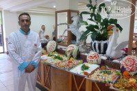 Обслуга и питание: Обслуга понравилась, все вежливые и опрятные. Каждый день в номере порядок наводили, украшали постель цветами. Кормили хорошо, голодными не ходили, доже переваривать не успевали. Много овощей и различных салатов, тушёных овощей, фрукты на обед каждый день арбуз, дыни, грейпфрут, были оливки, маслины, кукуруза, салат из мидий. Из мясных блюд курица, индюшатина, рыба была 2 раза, баранина. На завтрак разный сыры, творог, варенье, мед. Все очень вкусно. Спасибо поварам. Отдельное спасибо шеф-повару- золотые руки!!! (к сожалению не знаем имени, но есть на фото )))). Пиво в баре, вино белое, красное местного розлива, чай, кофе, и т.д.