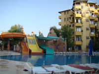 Прибыли в отель в 11 часов. На рецепшене нам с серьезным деловитым видом сказали ждать до 14 как положено. через 1 минуту нас подозвали и сказали, что у них есть новый корпус, это земля и небо в сравнении со старым, что "пойдем номера посмотришь" и за денежку мы вас раньше поселим. Раньше я никогда за номер не платила (и не предлагали) и в этот раз тоже не было желания платить. после общения с другими отдыхающими была ясна такая система: если не платишь сначала долго ждешь, потом тебя селят в двухсотые номера из которых вид в стену бассейна или горок и солнце туда даже не попадает (не считая вида на забор со стороны улицы) после того как возмущенный турист идет на ресепшен просить другой номер они просят еще подождать.... потом с видом "ну так и быть мы нашли вам номер получше" селят на этаж выше. Нас переселили в 336 угловой номер, где мы и остались. Одна девушка, с которой мы общались, перешла на 3ю стадию размещения и после трехсотых номеров попросила опять переселить и за 60$ ее поселили на след. день в новый корпус. И, как она сказала, - там номер был очень хороший. Наш номер был не отличный, но получше 222го)) плесени в 3 раза меньше, можно было сквозняк сделать в комнате. ремонт если и был там, то просто покрасили стены и мебель. туалет в отличие от 222 номера - работал) телевизор, правда, нам так и не сделали - но мы и так его смотреть не собирались. Кондиционер центральный, работал по часам (с 07:00 до 09:30, с 12:30 до 20:00, с 21:00 до 02:30) Но в последние дни нашего пребывания в отеле кондей работал постоянно.