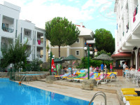 Впечатления об отеле самые хорошие. Персонал дружелюбный, и - да, действительно, на русском языке говорит только Мустафа - на разговорном уровне. Размещение - достаточное для отдыха, убирали чисто, выполняли все просьбы. Вся техника в номере - холодильник, кондиционер - работали прекрасно. Кормили хорошо, для вегетарианцев, как я, вообще рай, но и для мясоедов, коим является мой муж, тоже будет из чего выбрать. Мы отдыхали в этом отеле с ребенком 3х лет, и ей тоже всего хватало. Единственное - невозможно было пить эти соки "Юпи", мы и не пили, покупали соки и охлаждали в холодильнике. И, как нам сказали, в 5* дают те же самые Юпи, так что мы не расстраивались. И из фруктов были только дыни и арбузы, так мы их наелись и еще стали докупать в соседнем супермаркете дыни, инжир, нектарины - все по 40р. за кг, и прекрасно себя чувствовали. Для детей в отеле есть отдельный маленький бассейн глубиной 45 см, больше ничего нет, но в отеле мы только ночевали и приходили кушать, по большому счету. Вся информация - описание отеля соответствует истине, за исключением расстояния до моря - не 200 метров, конечно, около 400, мы с ребенком доходили где-то за 10 минут. Фото хотельера также соответствуют действительности, за исключением фотографий под номерами 4 и 7 - видимо, они были сняты ранее. Прилагаю также наши фотографии. В целом Мармарис - очень красивый город, изумительные окрестности, море, горы... Куча ресторанов, баров, магазинов... Весь день жарко и расслабленно, а часам к 8 вечера народ начинает оживать, наряжаться - и на променад и на Барстрит))) Кстати до него от отеля далековато, пешком наверное с час, и мы этим были очень довольны) В целом рекомендую этот отель для людей, которые хотят спокойно отдохнуть по своей собственной программе, будь то "День - сон, ночью - Барстрит", или "Ночью - сон, а днем - море, магазины и экскурсии"))). Всем хорошего отдыха!
