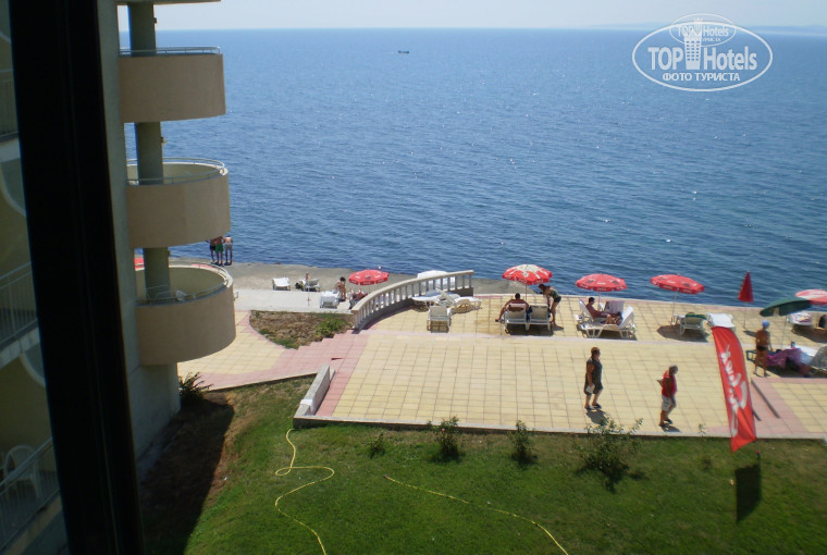 Что касается территории отеля.Не большая,но нормально.В Поморье вообще мало отелей с территорией.Только большие отели в новой части города.Лежаков и зонтов в отеле мало.Мы вставали к семи часам,что-бы занять места и зонт.К восьми уже было всё занято.Пляжа как такогого при отеле нет.Камни и нет входа в море.Но мы,как и многие,умудрялись по камням спускаться в воду и плавать.До нормального пляжа нужно прогуляться.