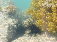 Так же с обратной стороны небольшого островка, на котором находится риф, располагается лежбище черных морских ежей, на мелководье обитают маленькие ежики, множество морских звезд, еще видели каракатицу, которая удачно маскировалась под камень, ну, и крабов, конечно.