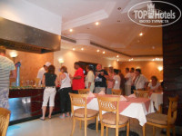 Первое время вечером горячая вода текла нормально,но приехал народ и начались перебои,особенно перед ужином,когда все поласкаются,видимо вода застревала на первых этажах:))Ужин начинается в семь,народ скапливается перед входом в главный ресторан,потому что знают,что мест может на всех не хватить,кормят примерно одинаково изо дня в день,не скажу,что плохо,для египетской тройки вполне сносно,на ужин есть суп,какие-то салаты,гарнир из риса,картошки,курица в кляре и что-нибудь готовят при вас,рыбу,печенку,мясо...делают пасту в томате с овощами,кстати,возле повара красивым девушкам нужно быть аккуратней,стоять подальше,потому что,засмотревшись Вашей внешностью,он может плеснуть масло мимо сковородки прямо на Вас(у нас так было).Десерт традиционно вкусный,фруктов действительно мало,наверное не сезон,были арбузы не спелые,какие-то зеленые апельсины и финики,по завтраку тоже все хорошо,пюре,сосиски египетские из салфеток,огурцы,помидоры,брынза и конечно омлет изумительный,плюс кофе-чай-юппи которые можно прикусить все тем же десертом вечерним:)) были попытки на завтрак с собой взять пару булочек на пляж,не прячась,в открытую,но приходят официанты и просят ничего не брать,просят вежливо,извиняются,но такие правила,я конечно это знал,но девушка первый раз в Египте,ничего в этом не видела криминального,это ее тоже озадачило,тем более,когда какие-то парни выносили в открытую в салфетках мимо "смотрящего" у входа,а он,как тупой баран начал пальцем тыкать в булки и вопеть "экскюзми,донт тайк..." а парни в ответ "Спасибо"(наверное думали,что этот тип говорит про булочки,что они вкусные и желает им приятного аппетита).