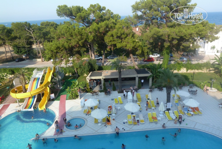 В этом отеле мы отдыхали в июле 2011 года семьей. Начну сначала. Приехали мы в отель часов в 10 утра, подождали буквально 20 минут и нам предложили семейный номер в главном корпусе на 3 этаже с видом на море и на бассейн. Нам очень понравился. Заплатили 10 долларов. Разместились. Минус в последствие оказался в том, что на пять человек одной ванны и туалета мало. Теперь, конечно, будем брать отдельные номера. Анимация была в основном для молодежи, но все-равно было интересно, Валентин - молодец! Детям тоже было не скучно,даже успели выступить с танцем на вечернем шоу. "Шоу", конечно круто сказано - так, мини капустник. Здесь тоже был минус, сцена (амфитеатр), находилась в углублении, я почти никогда на выступлениях не задерживалась, так как было очень жарко, "ни ветринки" туда не попадало. В этом смысле выручал балкон: мы садились у себя в номере, с какими-нибудь напитками и смотрели представление сверху,очень даже не плохо. Питание было не разнообразным,говядина за 10 дней была пару раз, рыба тоже, в основном курица в разных проявлениях, овощи нужно брать не в салатах - это точно. Фруктов практически не было - три вида за все время: яблоки, сливы и арбуз (не фрукт). Черешню,персики и т.д. мы покупали рядом с отелем по 10-15 долларов, соки детям тоже. Про очереди - чистая правда, но опять же мы не возмущались по-этому поводу, нас выручали дети, уж очень им нравилось нам приносить всякую всячину (блинчики,гриль и т.д.) Вообщем, кто и страдал от скудности пищи - так это мой муж, все ему не нравилось. По-этому 4 за питание, так как никто не отравился. Да, и еще, красное вино всегда заканчивалось, не успев начаться, приходилось стоять и цедить маленькой струйкой, но опять позитив, почти всегда в этот момент с кем-нибудь, кто ждет своей очереди поболтаешь, пошутишь. В смысле напитков в отеле даже жадноваты, колу и др.напитки часто наливали в пластиковые стаканчики, мини- бар вообще не функционировал. А вот сладостей было очень много и очень вкусные! Сервис: Номер убирали раз в три дня, постель поменяли один раз, хотя чаевые мы оставляли постоянно, на "лебедей" также не рассчитывайте, туалетную бумагу приходилось просить, шампуней,халатов также не увидите. Холодильник был не исправен (тек).Но полотенца меняли каждый день. На самом деле не понравилось по-настоящему только одно: ЭТО МУЖИК, КОТОРЫЙ ПРИСТАВАЛ К НАМ КАЖДЫЙ ДЕНЬ С ПОКУПКОЙ ШУБ,КОЖИ И Т.Д, ДОСТАЛ!!!!!! Еще бы пару дней и мы бы забыли уже о культурности! Море было чистым с утра - куча рыб, т.ч. мы плавали в 6-7 утра, пока никого нет и воду не взболтали. Пляжа могу сказать как такового тоже нет. Это большой минус. Лежаков и зонтиков правда не хватало ( хотя я читала, что это практически во всех отелях). И еще, в отеле в основном отдыхают русские, украинцы, турки, иранцы. Был такой момент, что в бассейне восточные женщины плавали прямо в одежде, что смущало нас и пугало наших детей. Считаю, что наш отдых в принципе удался, т.к. мы практически каждый день уезжали на экскурсии, концерты, развлечения (правда потратили на две семьи еще где-то 1200 долларов), по-этому нам было все очень не плохо. Советую съездить на "Огни Анатолии", очень понравилось. А в отеле есть очень хороший фотограф, фотки у нас получились супер - заплатили 250 долларов (фото+диск). Воздержусь от рекомендаций, т.к. привередливым точно не понравится, да и мы сами туда больше не поедем. С д