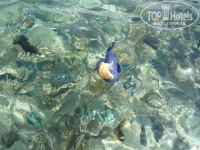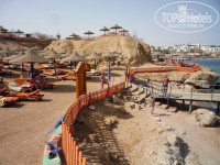 У отеля 3 пляжа. Два скалистых с понтонами и один песчаный. Вся дневная анимация проходит на песчаном пляже и у основного бассейна; на двух остальных пляжах- спокойно. Также большая площадка с песком и шезлонгами находится вверху на горе, только спуск к морю далековато. Пляж находится в бухте, так что если и был ветер, то совсем не сносящий с ног. Около каждого пляжа есть бар. Сразу хочу сказать, рядом с песчаным пляжем находится пристань для яхт, которые каждое утро в 9.00 забирают туристов на экскурсии и вечером в 16.00 привозят. Яхт очень много, что считаю существенным недостатком, так как присутствует запах солярки и некая непрозрачность воды.