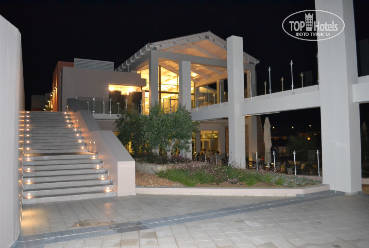 Отель совершенно новый, в 2011 году впервые принял туристов, соответственно 2012 г -только второй сезон работы. Отель выполнен в интересном сочетании стиля греческого традиционного городка или даже скорей деревушки и современного стиля хай-тек. Территория отеля со всех сторон окружена цепью не высоких гор. Территоррия огромная. Если лень добираться пешком до пляжа, аквапарка или какого -либо ресторана - персонал вас радушно подвезет на клаб-каре. Территория хорошо благоустроена, все красиво и ухожено. Но высоких деревьев, дающих много тени нет. Развлечений на территории отеля много: аквапарк, веревочный городок, две детских площадки, несколько бассейнов с барами и ресторанами. Был такой бар, в который можно было прямо приплыть из бассейна и тут же заказать напиток не выходя из воды. Очень много различных ресторанов и баров, везде хочется присесть и что нибудь заказать.