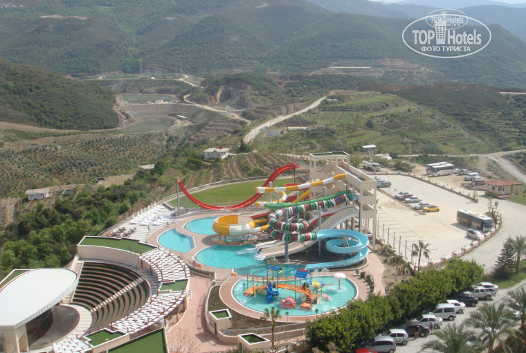 Расположен он на горе, потрясайщий вид открывается на горы и город Аланья, добираться до него сложновато, находиться в 130 км от аэрапорта и в 2 км от пляжа. Есть хороший аквапарк с несколькими бассейнами и горками.