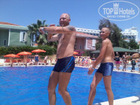 Территория отеля не большая (что плюс для семей с детьми), очень зеленая, читая и ухоженная. В бассейне 2 горки, лежаков у бассейна на всех желающих не хватает, но не потому что их мало, а потому некоторые отдыхающие занимают их с утра пораньше, а потом ими даже не пользуются. Мы никогда не бежали занимать лежаки. Приходили на завтрак к 9.30 смотрели какие лежаки просто простаивают и к 10 когда включали горки убирали с них чужие полотенца и занимали на час, полтора. Так же поступали и после обеда. На большее время они нам были не нужны, так как основное время проводили на море. Там лежаков на всех хватает. Ни разу претензий от тех кто их занимал не понятно для чего не получали.