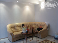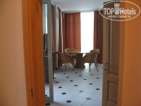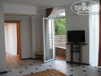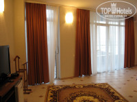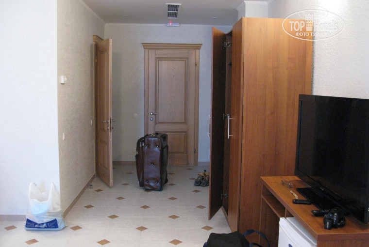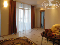 Т.к. в тот момент все номера стоили одинаково, то мы заселились в люкс комфорт на втором этаже. Очень хороший двухкомнатный номер с двумя санузлами, в одном ванная, в другом душевая. Две комнаты: спальня и гостиная. Гостиная большая с мягким угловым диваном, телевизором и журнальным столиком. Правда на диване у нас спал ребенок, при том что диван раскладывался поразительно тяжело. В связи с чем мы старались его и не задвигать, дабы лишний раз не травмировать. В спальне двуспальная кровать, телевизор плоский, уголок со столиком и четырьмя креслами (видно на фото). Если раздвинуть шторы, то панорамные окна с видом на море из спальни, очень красиво, а в другую сторону было видно побережье Ялты.
