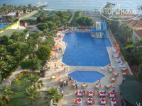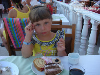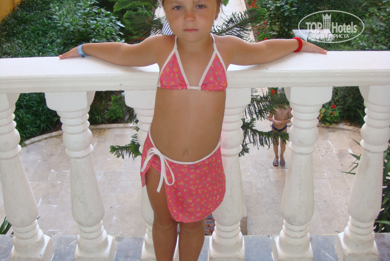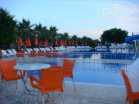 Поездка была с 01.06.12-08.06.12гг. Заселение как всегда в 14-00, принципиально не давали денег, муж уснул на ресепшене, номер дали отличный, виды с балкона в фото. Все работало на 5, ничего не поломалось, только дверь в номер малеха грюкала, но муж подкрутил разболтавшийся саморез и все было ок! Еды валом всегда, наши туристы хоть и ломились по-началу за мясом, потом поутихли, поняли, что все всего хватает с головой.Мясо-это курица (как и везде в Турции) и рыбка вкуснячая!!! Впервые попробовала запеченый тунец. Зачем людям там мясо есть, не понимаю... Бары работают до 23-30 (это самый поздний). Ребенок (5лет) в восторге от горок и вечерней анимации от мини клуба. Что еще поразило, так это работа мини-клуба: рисунок песком стоит 5долларов, если заплатите, с вашим ребенком будут рисовать аниматоры, а остальные сидят пыхтят сами на простом листочке карандашом...Море-это единственный минус-крупная галька, хотя там, где стоят лежаки-песочек. Проблема решается тапочками специальными за 10 баксов. Очень хорошее расположение отеля на первой линии, мое в шаговой доступности. Был бесплатный теннис по записи-большой и настольный, спортзал, хамам, парикмахерская, где плетут чудные косички деткам за 20 долларов, при отеле магазинчик со всем необходимым. Тем, кто впервые в Турции, возможно не понравится то, что некуда сходить, кроме базаров, но для этого есть экскурсии. В общем, мне понравилось все! Еще раз повторюсь, что за 33 тыс. на троих (уже с топливным) -это сказка! В нашем Краснодарском крае будешь жить в сарае за такие деньги и готовить борщ на плите...