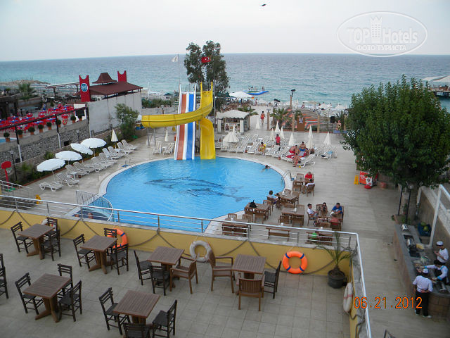 Отдыхали в этом отеле вдвоем с мужем с 16.06 по 24.06.2012. Приехали вечером, поздно, нас сразу заселили в отличный номер №341, с кондиционером, душем и двухспальной кроватью!!Питание в отеле хорошее, но не много однообразное, а так во общем-то всем всего хватает!!!Территория отеля маленькая, но очень уютная! Есть детская площадка, бассейн, горки. Персонал очень вежливый и не навязчивый, номера убирают каждый день, полотенца и бельё меняют каждые 2 дня!!Пляж мелкая галька, заходить в море терпимо, вот выходить немного сложновато!!Народ спасается специальной обувью!(по цене 10 у.е., через дорогу от отеля) Мы принципиально не покупали, в целях лечебного массажа)))) Море отличное, теплое, чистое!!!На территории отеля есть магазин кожаных изделий, с замечательной хозяйкой, любимицей всех отдыхающих и просто красивой девушкой Изольдой!! Она представительница фабрики кожаных изделий D*ENVER, каждый день бесплатно на автобусе возит всех желающих в Кемер на фабрику, за покупками или просто посмотреть! Чаще всего народ возвращается с покупками, вот и мы не устояли и приобрели куртку отличного качества, по отличной цене!!Так что рекомендуем туда прокатиться обязательно!!!Анимация в отеле просто замечательная, отличные ребята, веселят народ с утра до вечера!!!Также по вечерам вывозят с собой молодежь на разные дискотеки!!!Раз в неделю отель организует-"Турецкую ночь", интересное мероприятие!!!Одним словом- отдыхом мы остались очень довольны!!Отель на твердую 4*!!!!Если не располагаете большим бюджетом, то вполне подойдет для хорошего отдыха!!!