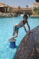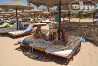 Территория поразила своими размерами и ухоженностью - цветущая живая изгородь, мягкие газоны, финиковые пальмы, два огромных бассейна. В одном бассейне в середине сделан "остров" с баром, на который ведут горбатые мостики, а в другом бассейне в центре барная стойка сделана так, что можно сидя попой в бассейне попивать пивко (что мы иногда и делали). Пляж большой с довольно потрепанными деревянными лежаками, но матрасы на лежаках компенсирую эту потрепанность. Мест всегда хватало. Недалеко от берега на глубине метр-полтора есть пара-тройка небольших рифов с рыбками. Но если дойти до мыса (влево вдоль берега метров 800) - там на глубине риф поприличниее и туда всегда приплывают лодки с ныряльщиками.