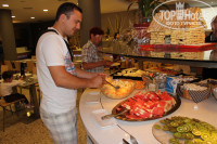 У нас в стоимость путевки был включен только завтрак. Мы вставали к 8, народу не так много. Но разнообразие нас порадовало. Несколько видов яиц, бекон, несколько видов сосисок, овощи (помидоры, огурцы, салат, морковь), хлопья нескольких видов, йогурты, там же можно сделать тосты с сыром и ветчиной, блины пекут, для них есть три вида топингов (шоколадный, клубничный, карамельный). Кофе, соки, десертный стол с пончиками, кексами круасанами и конечно фруктовый стол (дыня, арбуз, киви, грейпфрут каждый день)! Ну как тут можно сказать, что за две недели надоест однообразная еда? Каждое утро кушали по разному. При желании можно вечером с 19 часов сходить на ужин, 10 евро с человека. Вот ужин более чем разнообразен, рыба, птица, мясо, морепродукты (мы брали мидии пару тарелочек)))) картошка в разном виде, макароны с соусами, три вида салата, десертный стол больше чем на завтрак - тортики, чизкейки, желе разное. Кофе и соков нет. Но в виной карте вы можете заказать вино от 7.99 евро и выше, вкуснейшую сангрию, воду, напитки. Три дня в неделю тематические ужины (каталонский, японский, мексиканский), они уже подороже по 18 евро. Вот чем обусловлен отель 4 sup, все очень вкусное и разнообразное!