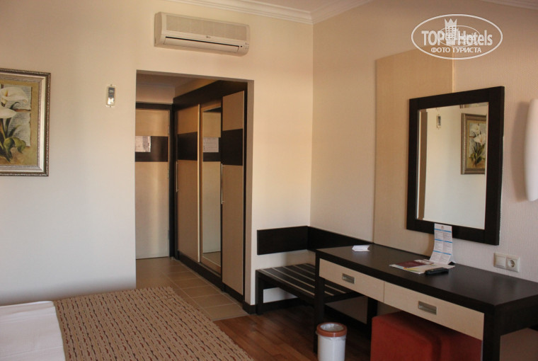 Отдыхали в этом отеле в июне 2012г. с 18.06 по 01.07. Заселили быстро, номер дали на 4 этаже, окна выходили на соседний отель, это никак не мешало. Сам отель хороший, чистый, кухня разнообразная, еды вдоволь на любой вкус. Для ребенка 2,5 лет не было проблем с питанием, утром и каши и молоко с хлопьями и булочки и много фруктов. По еду нет претензий. Замечания по сервису все же есть - пляж грязноват, много набросано фантиков, бутылок и т.д. сами туристы бросают, хотя по всему пляжу стоят урны, и мусор этот особо никто не убирает.Галечный заход в море, что неудобно, особенно с маленькими детьми и сразу глубоко, деткам маленьким особо не по плюхаться у берега. В номерах убирали каждый день, ставили воду, минералку и сок, всего по 2 бутылочки. У нас дочка в обед спала каждый день и было так, что из-за этого номер не убирали, мы просили не беспокоить, потом сказали на ресепшеп, что из-за дневного сна ребенка наш номер не убирают, попросили поставить уборку в номере на утро, и стали убирать по утрам, так что спасибо им за это. Жаль, что территория не большая, но зеленая. За отелем погулять не где, везде стройка, есть торговые центры небольшие, в основном кожа и сумки. По алкоголю: ультра все включено - только напитки местного производства, попробовали мартини - так себе. Красное вино не понравилось, белое понравилось. Муж брал местную водку "кремлевская" - пить можно, еще местное виски пробовал пару раз. По "аля карт": ходили в барбекю и итальянский, барбекю больше понравился. Анимация: развлекают целый день, у бассейна, на пляже, детская анимация, и вечерняя. Понравилось выступление бразильской труппы, один раз за дне недели была живая музыка.