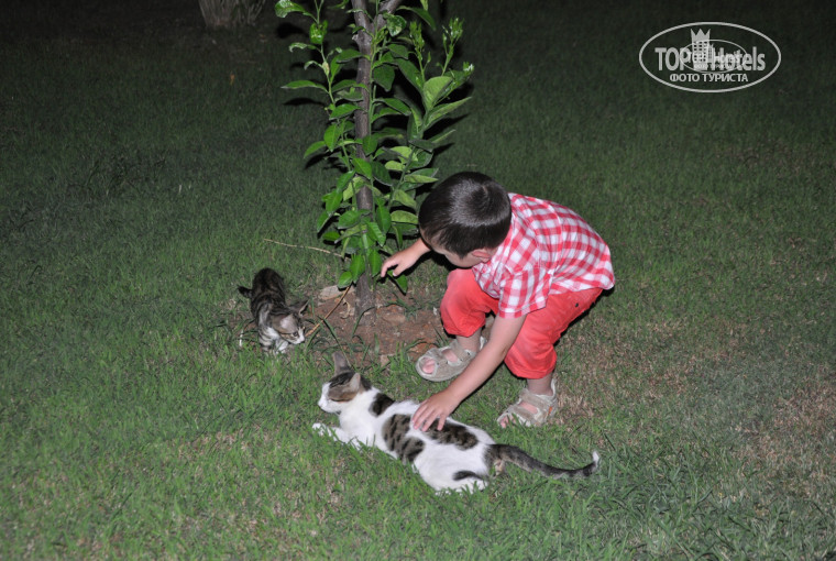 Очень понравилась территория отеля - всё в зелени и чисто. Много кошек, которые всех умиляли, особенно детей. Прекрасная детская зона: сам мини-клуб, где маленькие детки заняты рисованием/поделками, просторная зеленая детская площадка с качельками и лазалками и отличный бассейн с горкой-осьминогом. Был ещё малышковый бассейн чуть дальше, с другой стороны олимпийского бассейна, но он не особо пользовался успехом.