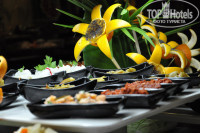 На завтраки подавли сыры, вафелльки, тосты, хлебушек, фркуты, овощи, сосиски говяжьи, колбаски, каши овсяная, рисовая, манка, омлеты, яйца 7 и 5 минут, варенье, шоколад, арбузы, дыни, бананы, сливы,яблоки, виноград, нектарины, персики, апельсины, мед в сотах.