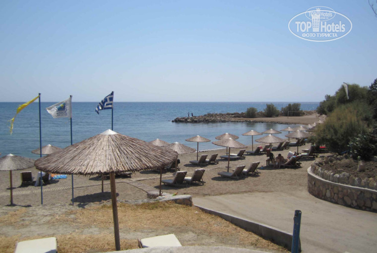 Общее по пляжу - песочно-галечный, бассейн, лежаки у бассейна, конечно, бесплатные. А на самой пляже платные, 4 эвро. Но они не нужны, т.к. вы лежите около бассейна и спускаетесь по небольшим ступеням к морю. Лежаки занимались с утра. Всех вроде хватало.