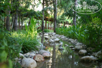 Отель сам утопает в зелени, территория большая. Через весь отель над дорожками есть тент крыша деревянно черепичная. От этого можно в тени гулять в любую жару.